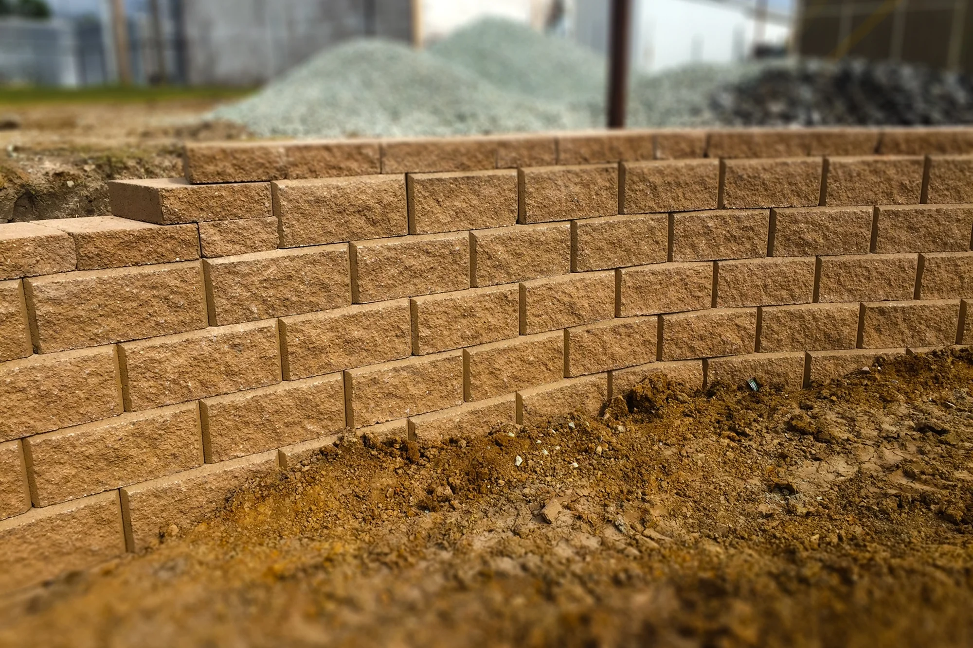 Interlocking concrete blocks aligned to create a modular retaining wall. Typically installed to hold back sloping soil and provide a clean vertical face. Proper retention is required to maintain a stable, long lasting formation.